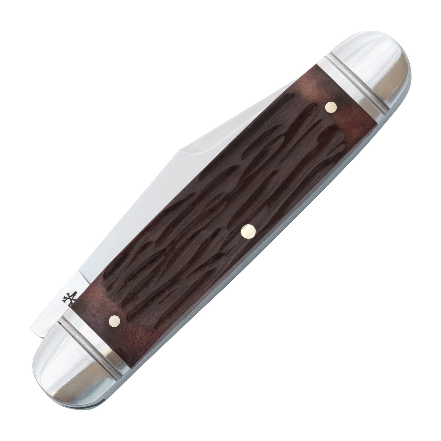The RoseCraft Blades Birchfield Camp Jack Brown Jigged Bone is a traditional cigar pattern that features a 2.9″ 14C28N clip point blade with a brushed satin finish, long pull, half-stop and heavy swedging. It has hand-jigged Brown Jigged Bone covers with brushed stainless steel bolsters, liners, and nickel silver pins. It carries the RoseCraft Rose Bomb shield. It’s 3.625” closed, 6.5” overall, and weighs just 2.9oz. Designed by Andy Armstrong.
