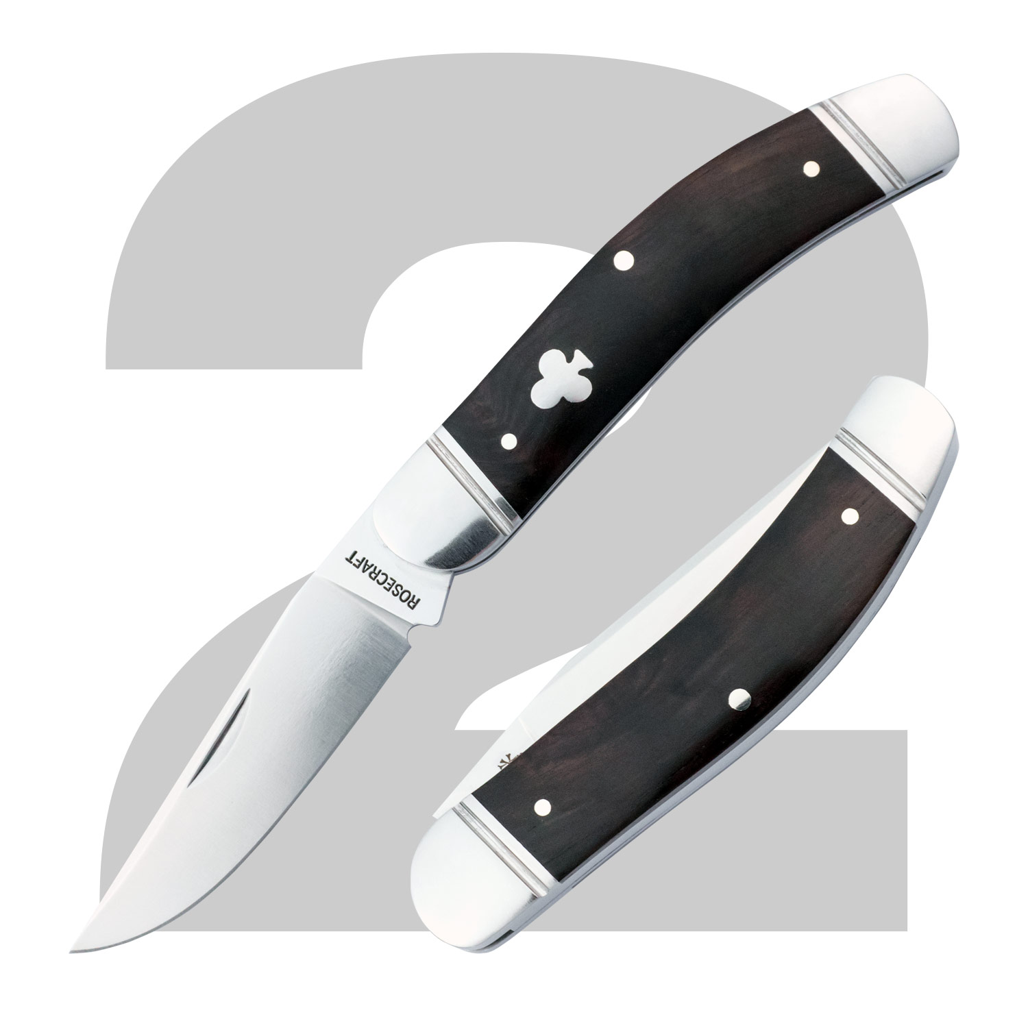 The RoseCraft Blades Stinking Creek Sowbelly RCT023-BSW is a one-bladed jack that features a 2.7″ D2 modified clip point blade with a brushed satin finish, a half stop, and heavy swedging. It has genuine black sandalwood covers with brushed stainless steel bolsters, liners, and the new RoseCraft “Clubs” shield. It’s 3.875″ closed, 6.6″ overall and weighs 3oz. This is an original pattern designed by Andy Armstrong.